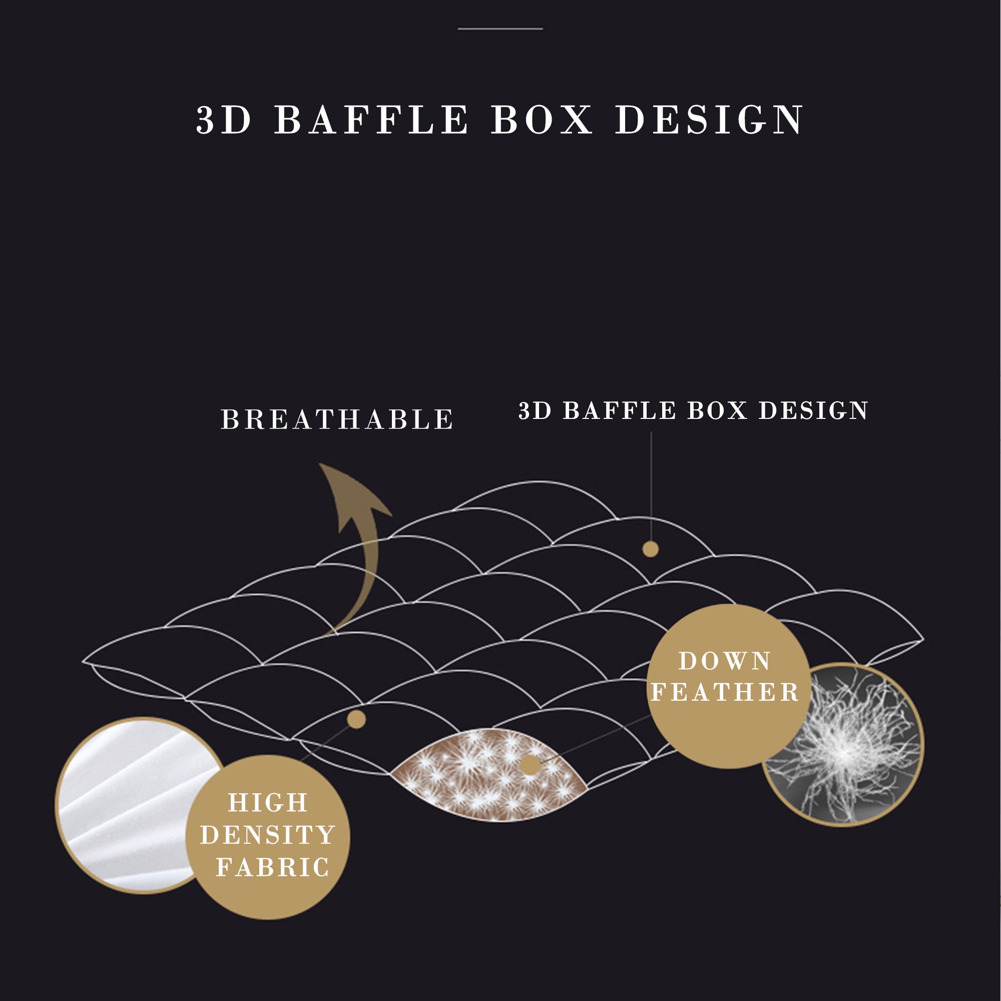 - BAFFLE BOX DESIGN: The unique 3D design includes premium down filling, 8 duvet loops and a deluxe black pipped edge. The beautiful three-dimensional fabric stitched boxes allow maximum thickness and comfort while maintaining even fill distribution. This unique construction minimizes migration of fill, so the down doesn't shift or clump in one section.